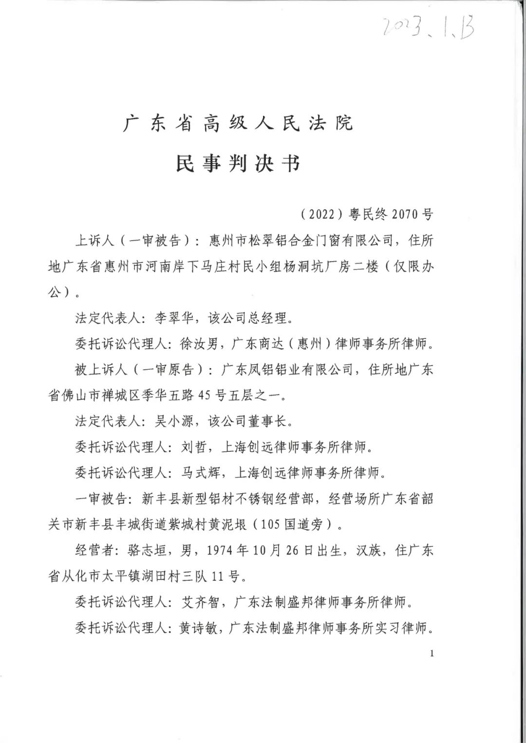 萍乡辉知胜诉佳讯 | 侵害“凤铝”商标案广东高院二审维持原判,判决赔偿255万元